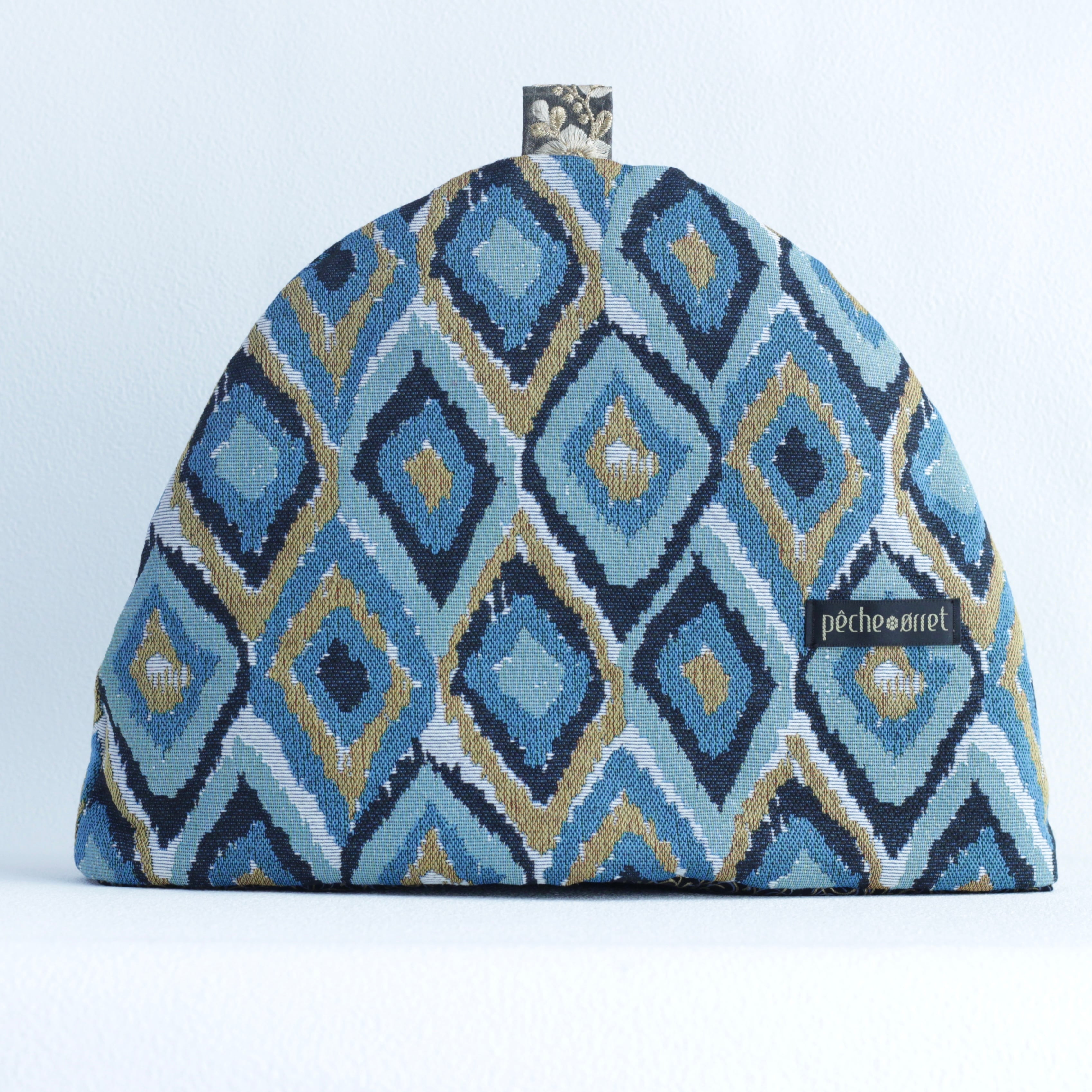 深みのあるブルーを基調に幾何学模様が織り込まれたゴブラン生地のティーコゼーです。